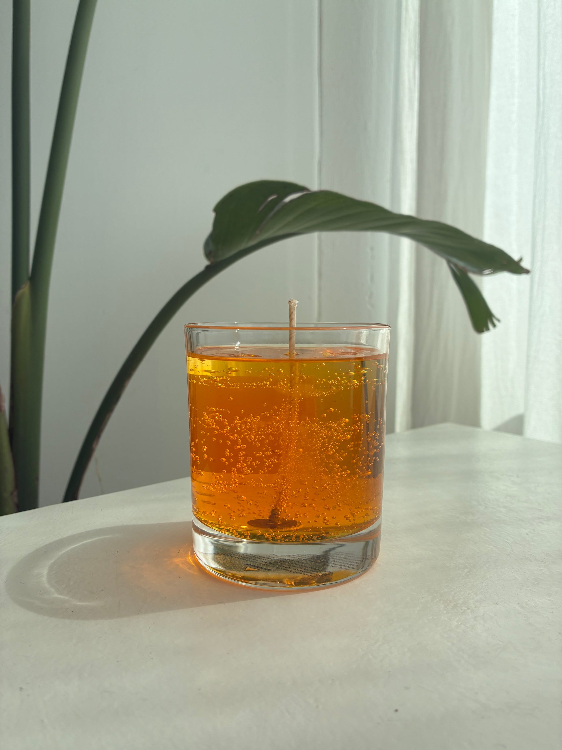 Die Kerze besticht durch einen lebendigen Farbverlauf – von spritzigem Orange bis hin zu sonnigem Gelb. Der Look erinnert an ein frisch serviertes Glas Aperol Spritz, das im Abendlicht funkelt. Als besonderes Highlight zieren detailgetreue, transparente Gel-Eiswürfel die Oberfläche – ein absoluter Hingucker mit authentischem Touch.