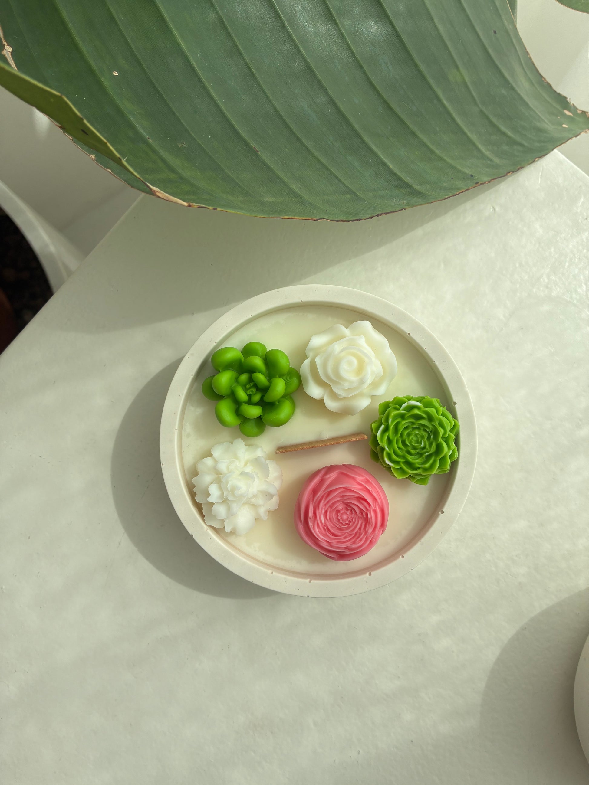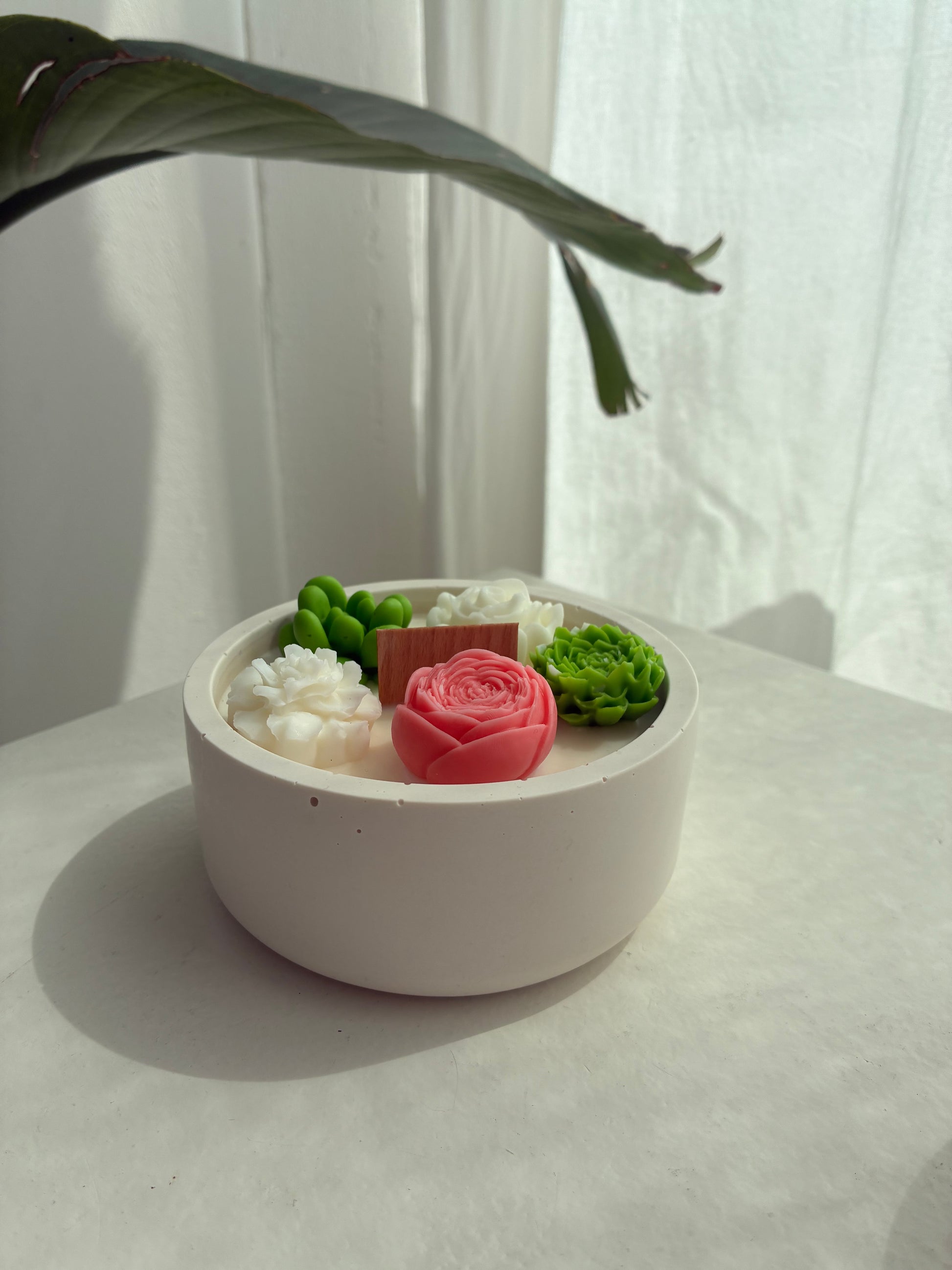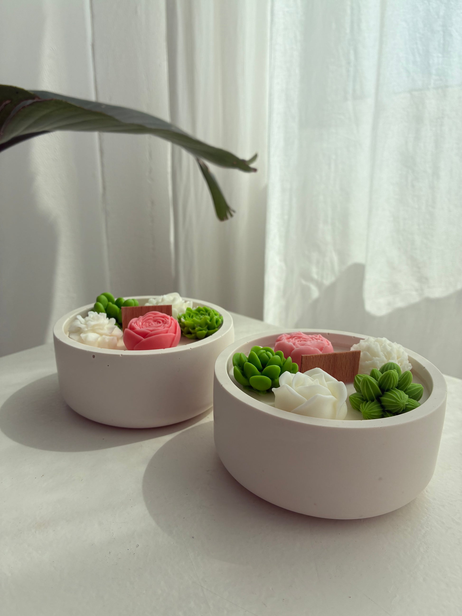 Der handgegossene Behälter aus hochwertigem Acrylharz bietet nicht nur eine edle Haptik, sondern auch eine natürliche Optik, die perfekt zur Wüsteninspiration passt. Die untere Hälfte ist mit reinem, weißem Wachs gefüllt – auf der Oberfläche entfalten sich liebevoll modellierte Kaktus-Elemente aus farbigem Wachs, die jedes Stück zu einem botanischen Kunstwerk machen.