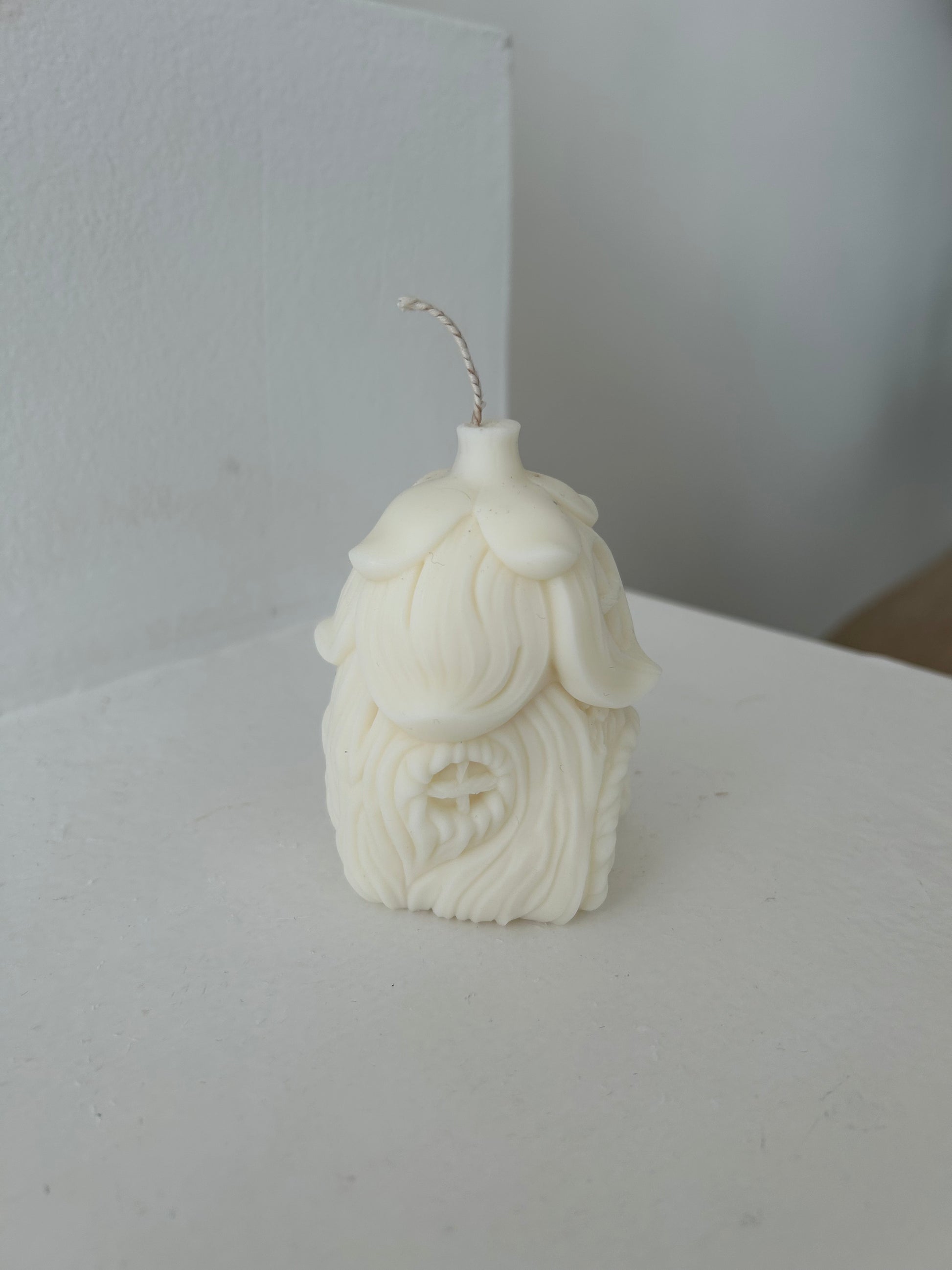 Die skulpturale Form zeigt ein stilisiertes Häuschen mit feinen Strukturen, die an verwunschene Wurzeln, Blätter oder Blüten erinnern. Im Kerzenlicht entsteht ein sanftes Schattenspiel, das den märchenhaften Charakter der Kerze lebendig macht. Ob auf dem Nachttisch, im Regal oder als Highlight einer jahreszeitlichen Deko – das „Feenhaus“ bringt ein Gefühl von Wärme und Geborgenheit mit.