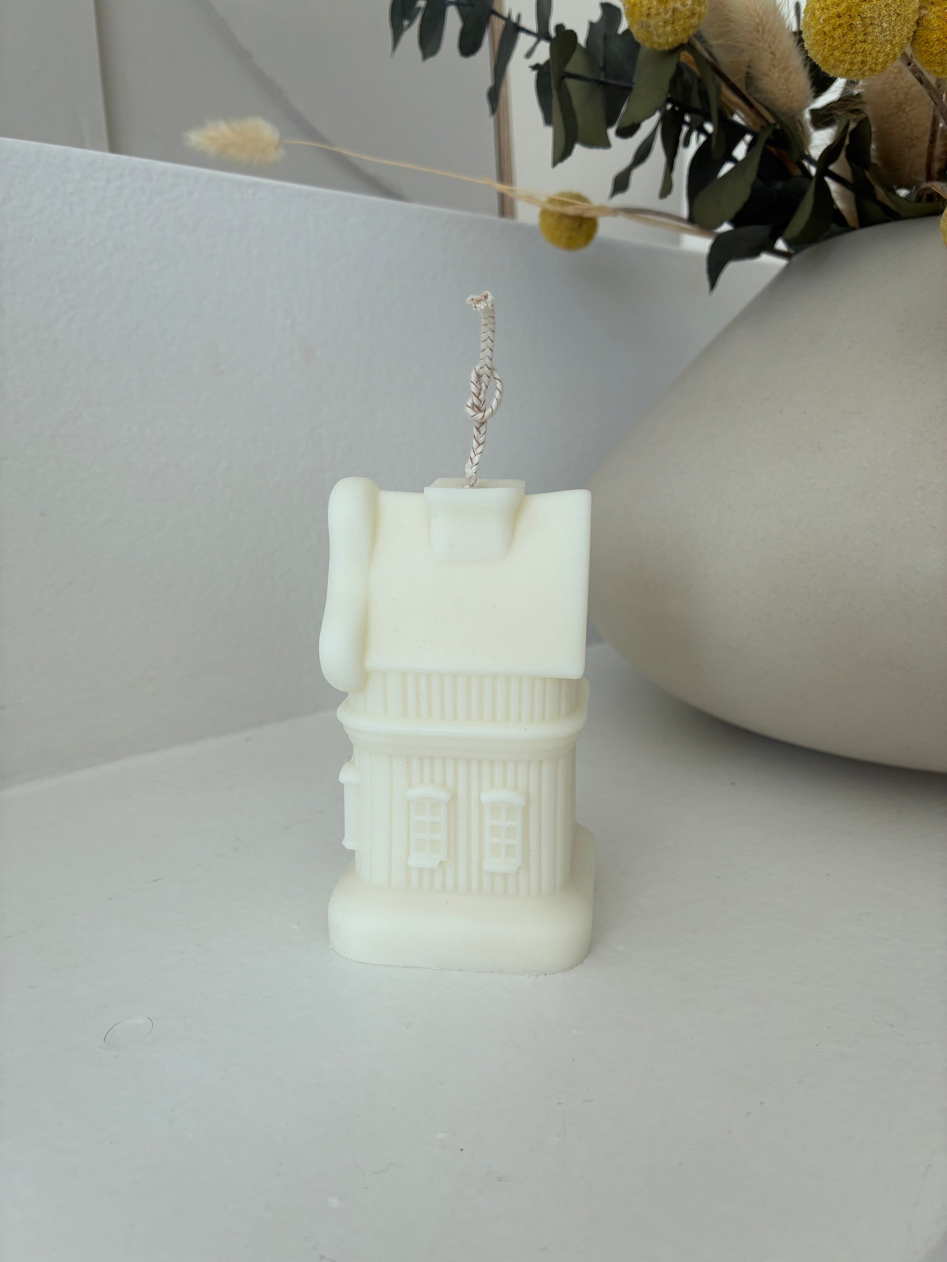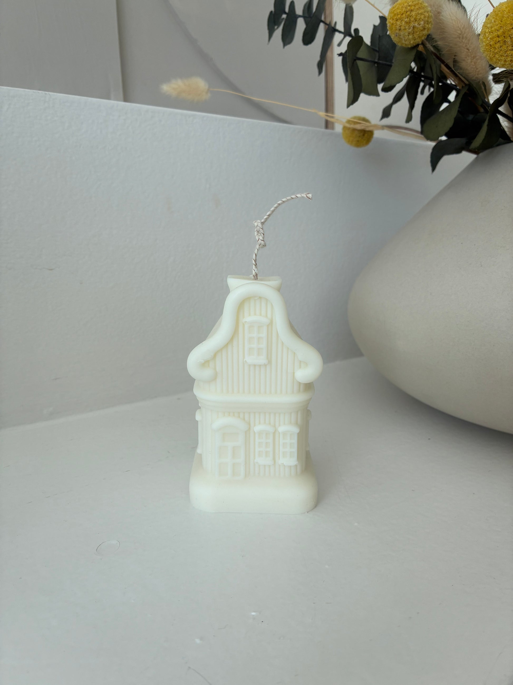 Die Kerze besticht durch ihre klare Form, die an ein kleines Häuschen erinnert – mit sanften Linien und einer matten Oberfläche in weiß. Ihre schlichte Schönheit macht sie zum idealen Begleiter für moderne, skandinavische oder romantische Einrichtungsstile.