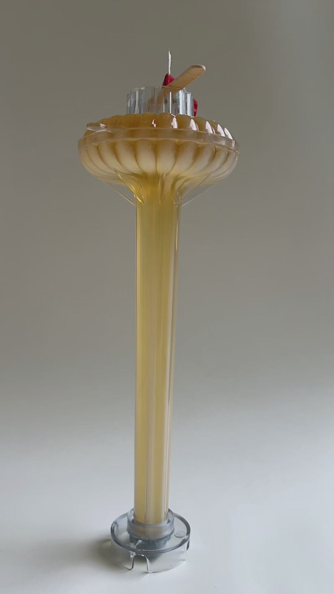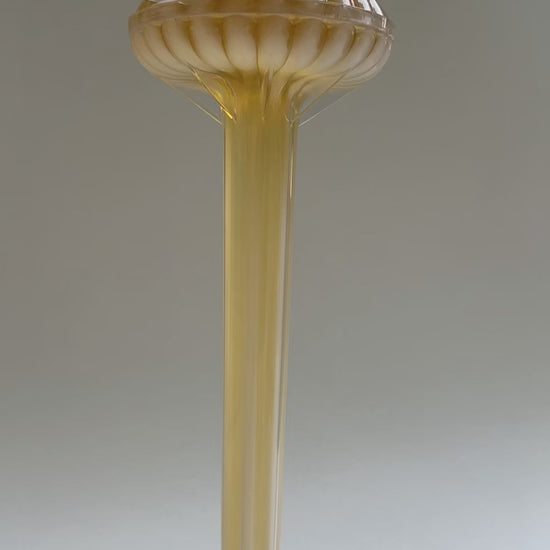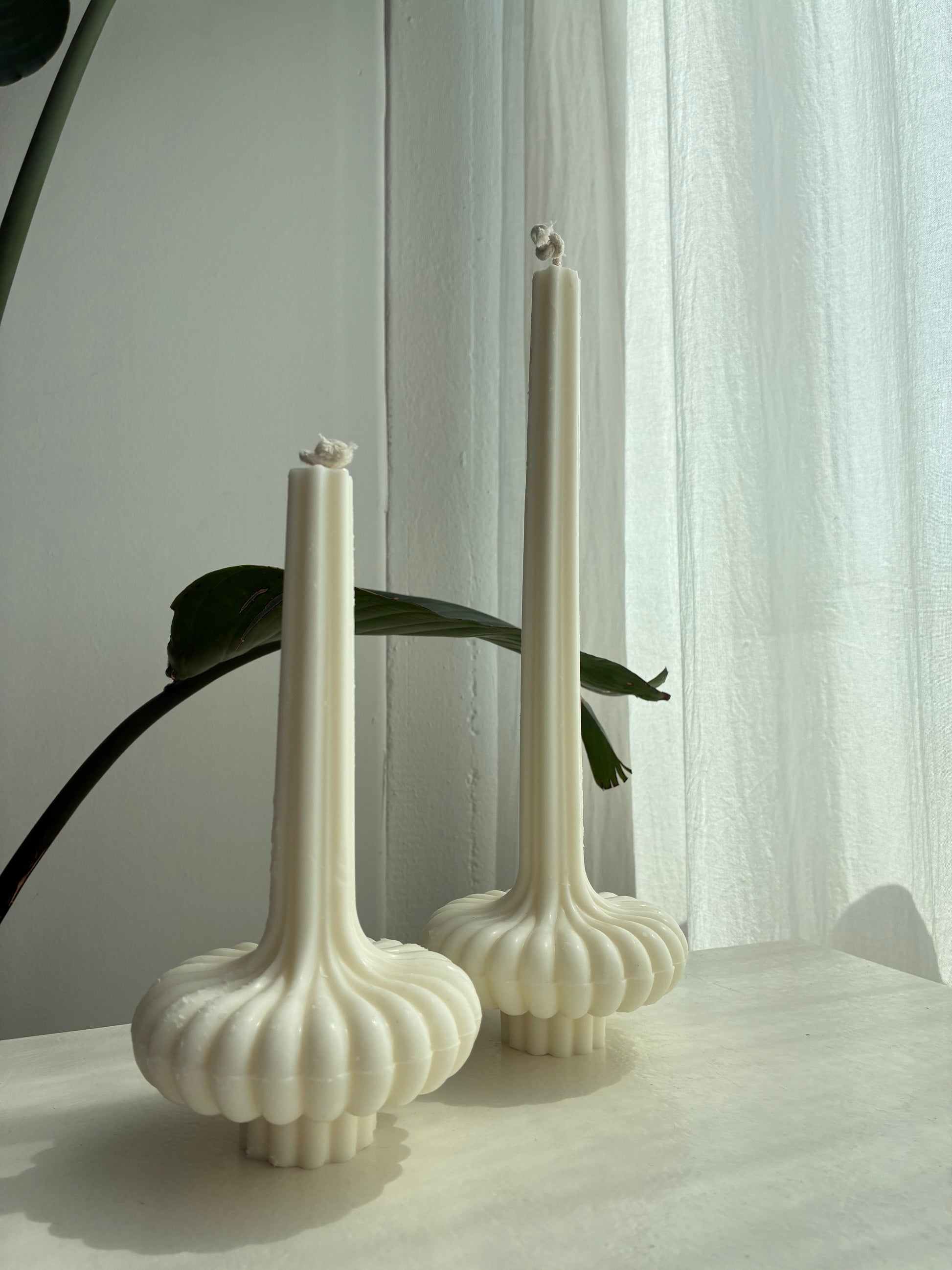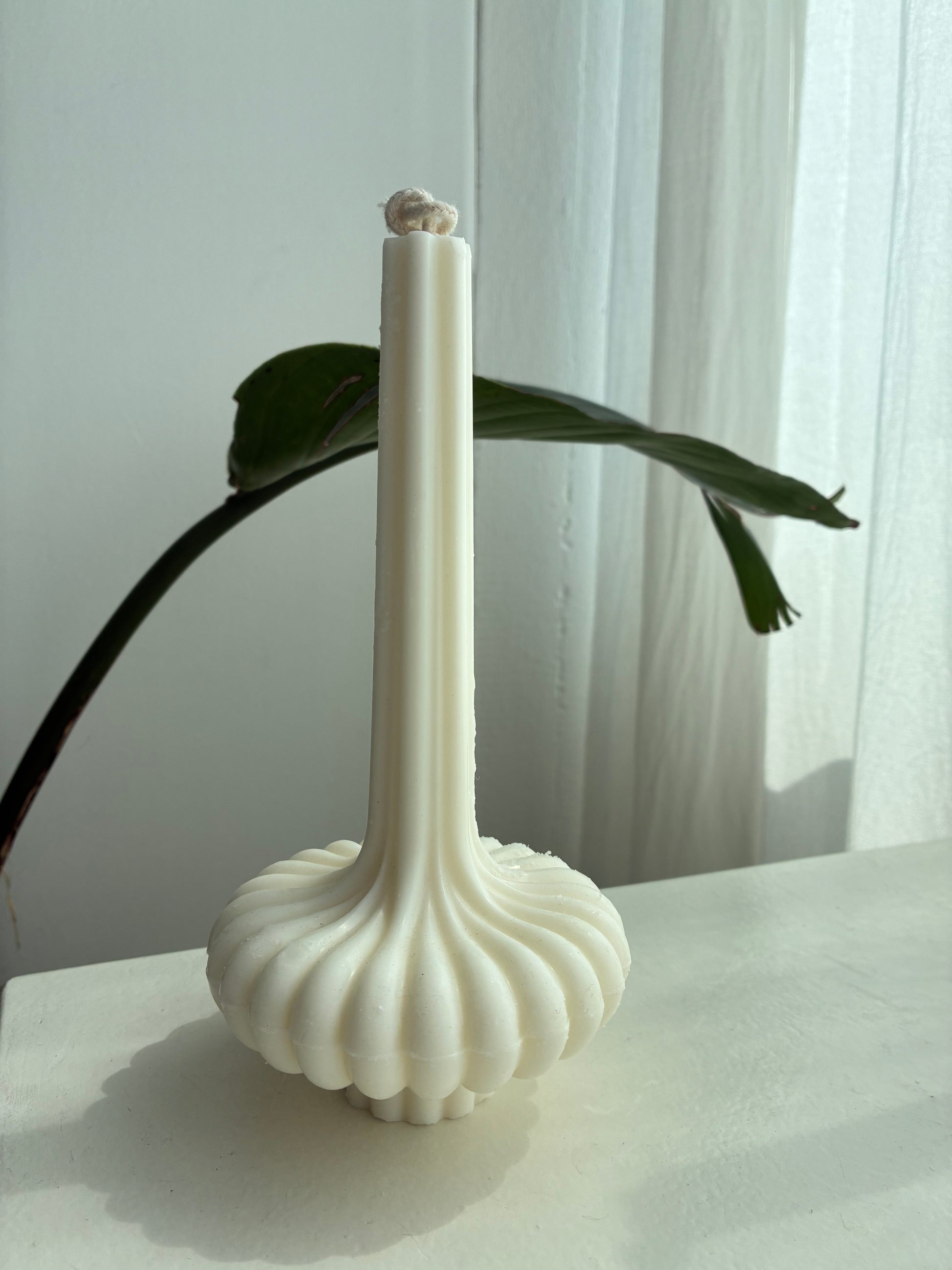 Der schlanke Kerzenkörper (ca. 2 cm Ø) wird von einem geriffelten, kugelförmigen Fuß getragen, der an eine Blütenknospe oder ein stilisiertes Architekturmotiv erinnert. Das markante Relief verleiht der Kerze Tiefe und einen spannenden Kontrast zur glatten Oberfläche des Schafts.