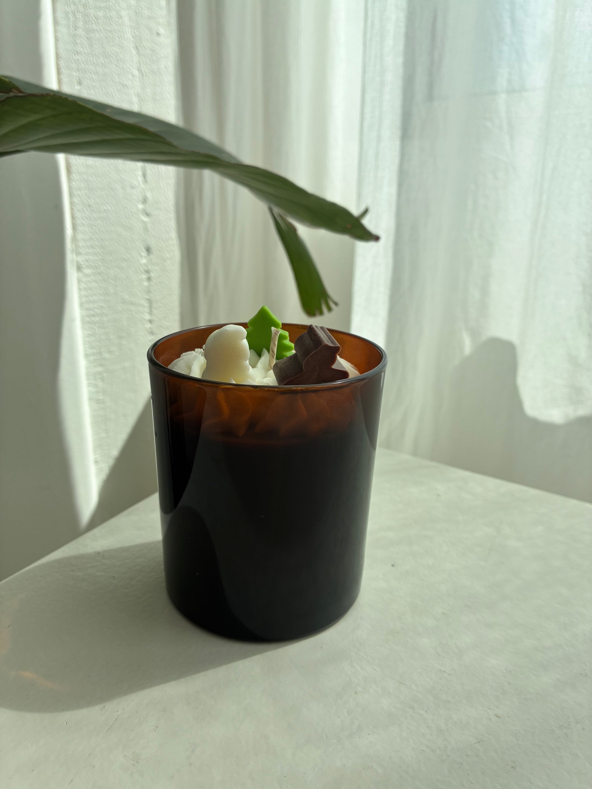 Handgegossen in einem eleganten, dunkelbraunen Glas, kombiniert diese Kerze verspielte, weihnachtliche Wachselemente mit einem edlen Look. Ob als Highlight in deiner Winterdeko oder als liebevolles Geschenk – sie sorgt sofort für festliche Stimmung.
