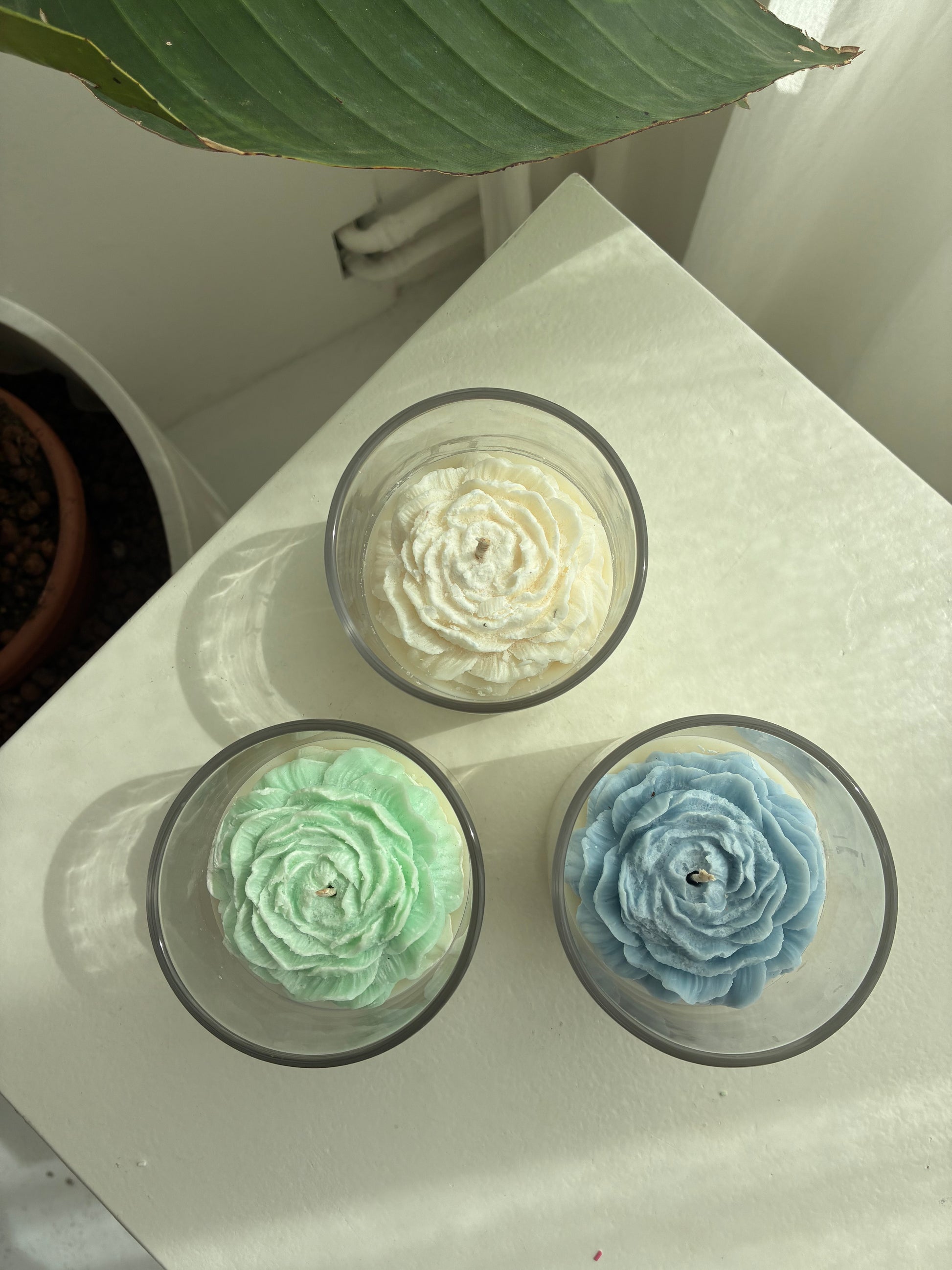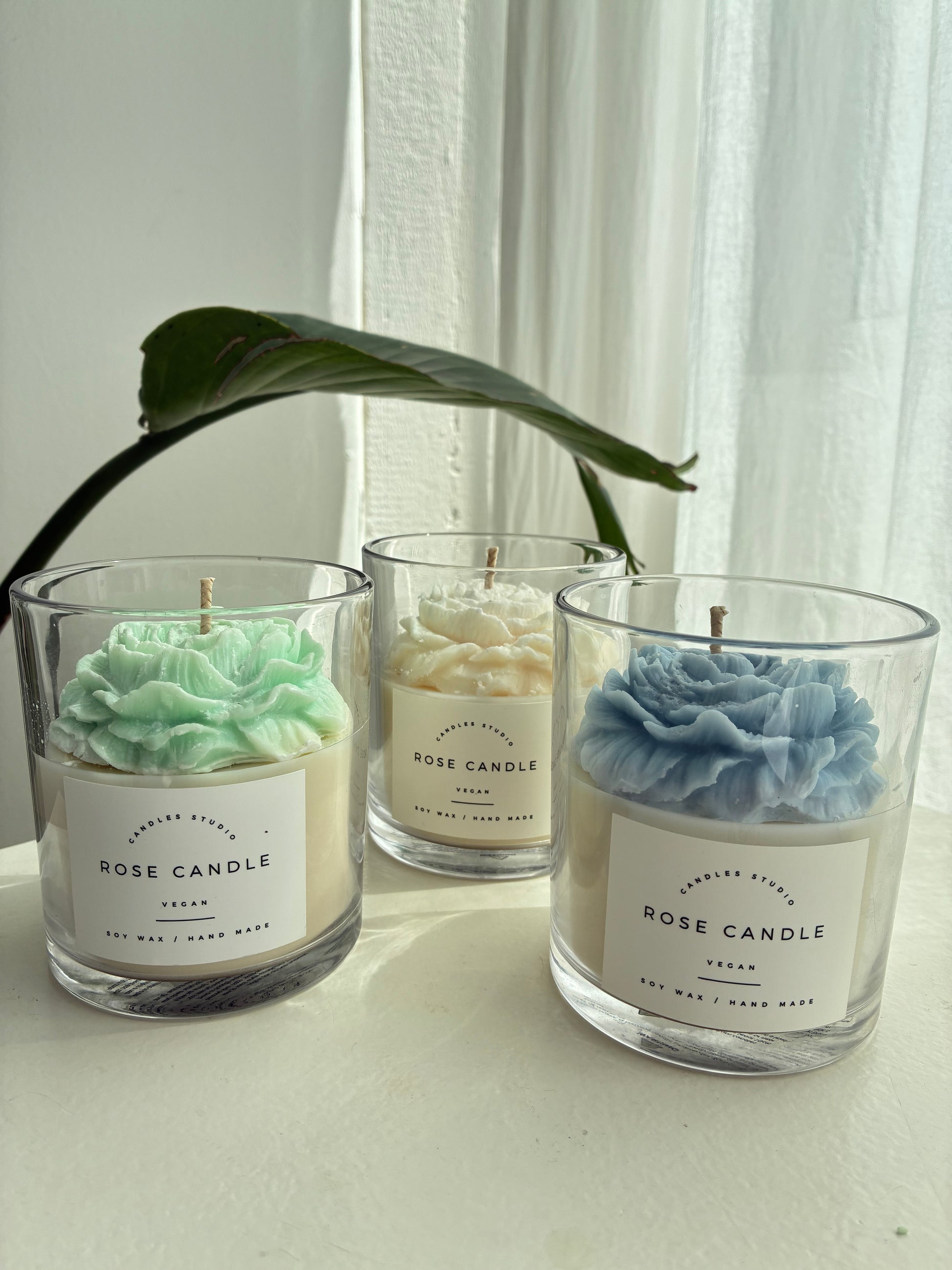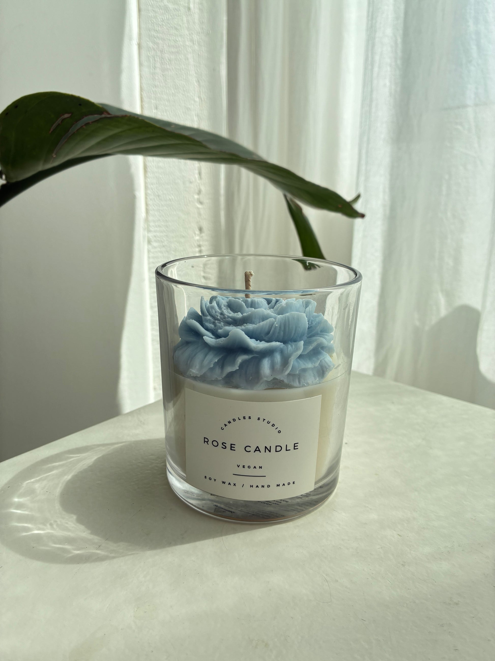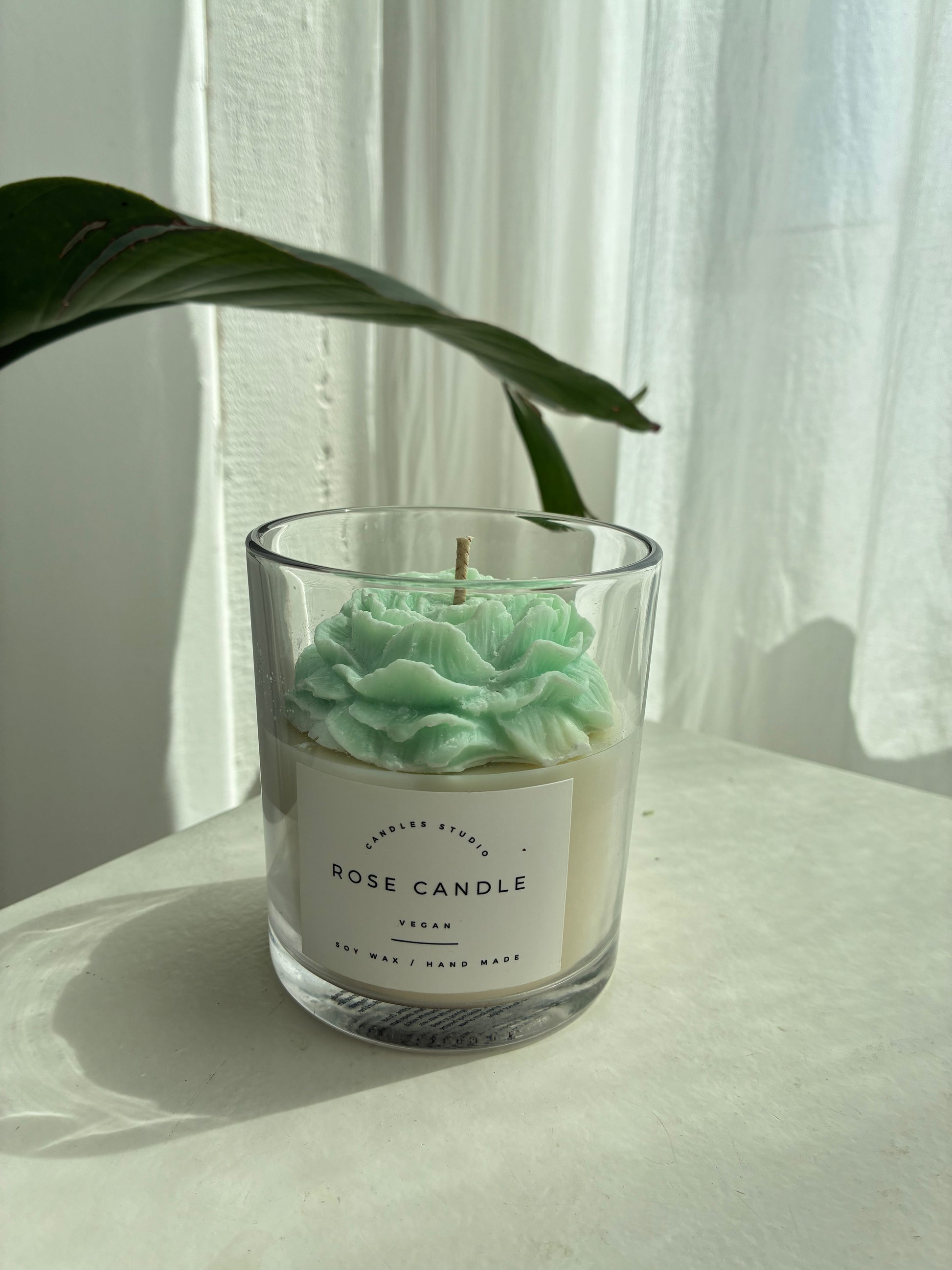 Die Kerze wird bis zur Hälfte mit reinem, weißem Wachs gefüllt und bildet damit die ideale Bühne für das Highlight: eine kunstvoll gestaltete Wachsrose, die auf der Oberfläche thront. Wähle aus vier sanften Pastelltönen – Blau, Grün, Rosa oder Weiß – und finde den Look, der perfekt zu deinem Stil oder Anlass passt.